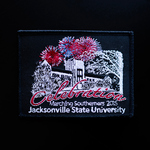 This embroidered uniform patch was designed by Jesse Stevens for the 2015 Marching Southerners show. The show's theme was "Celebration".The patch depicts fireworks over Bibb Graves (later renamed Angle) Hall.