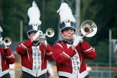 The Jacksonville State University Marching Southerners perform during a Fall 2000 performance, possibly a band exhibition performance at Tuscaloosa County High School in Northport, AL. The 2000 show title was "A Night in Birdland." Opener was "Birdland," the ballerina tune was "Night in Tunisia/Harlem Nocturne," and the closer was "Strawberry Soup." The band was under the direction of Kenneth G. Bodiford. (before October 2000)