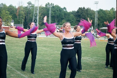 The Jacksonville State University Marching Southerners perform during a Fall 2000 performance, possibly a band exhibition performance at Tuscaloosa County High School in Northport, AL. The 2000 show title was "A Night in Birdland." Opener was "Birdland," the ballerina tune was "Night in Tunisia/Harlem Nocturne," and the closer was "Strawberry Soup." The band was under the direction of Kenneth G. Bodiford. Shown are ballerinas. (before October 2000)