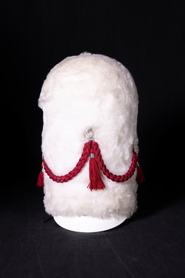 A white drum major shako hat with red cords, worn by circa 1967-1969 JSU Marching Southerners drum major Homer Smith. [Hat donation courtesy of Homer Smith]