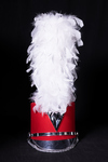A red shako hat with white plume, worn by JSU Marching Southerners members 2015 to present.