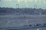The Jacksonville State College (now Jacksonville State University) Southerners Marching band and ballerinas are shown on the football field during a performance. Drum major was Freddie Pollard, featured twirlers were Jerry Hill and Dottie Wright. Head ballerina was Janice Collins. (circa 1962) [courtesy of Joe David Walters]