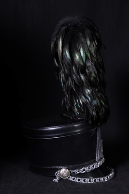 A black shako hat with black and green plume, worn by JSU Marching Southerners members 2005 to 2014. At times white plumes were worn.