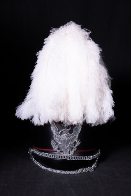 A black shako hat with red horizontal stripe, silver eagle emblem, and white plume, worn by JSU Marching Southerners members 1995 to 2004. In 2003 and 2004 the plumes were black.