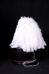 A black shako hat with red horizontal stripe, silver eagle emblem, and white plume, worn by JSU Marching Southerners members 1995 to 2004. In 2003 and 2004 the plumes were black.