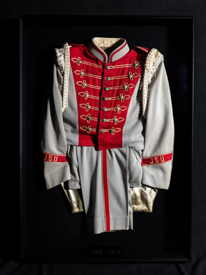 Grey uniform with red stripes on pants, red JSU band at sleeves, red front with buttons, and white cords comprised the JSU Marching Southerners uniform for members 1968 to 1974.