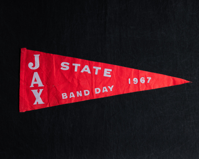 A red pennant used at Jacksonville State University reads, "Jax State Band Day 1967."