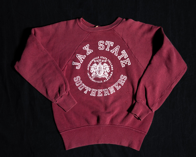 A maroon red sweatshirt reads, "Jax State Southerners, Jacksonville State College, Jacksonville, Alabama." (1966 or before)