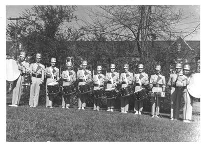 The Jacksonville State College Marching Southerners Drum Corps 1966-1967 members are shown in uniform. Shown from left are Joe Serviss, David Campbell, Jerry Mitchell, George Graham, Larry Culpepper, Larry Hogan, Jerry Silvy, Rick Bennett, Larry Beck, Scott Ragsdale, Gary Redwine, Solon Glover, Jr. [courtesy of Southerners alumni Jerry Mitchell (g. 1969)]