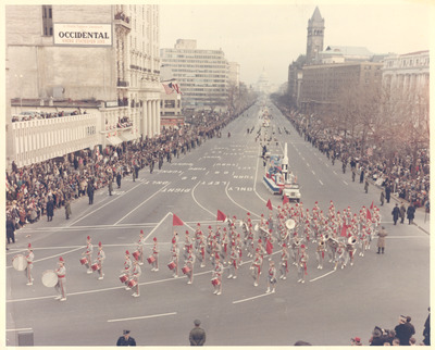 The Jacksonville State College band and its ballerinas marched in the presidential inaugural parade held January 20, 1965 in Washington, D.C. Shown members of the Marching Southerners march during the parade. [courtesy of Southerners alumni Jerry Mitchell (g. 1969)]