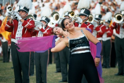 The Jacksonville State University Marching Southerners perform during a Fall 2000 performance, possibly a band exhibition performance at Tuscaloosa County High School in Northport, AL. The 2000 show title was "A Night in Birdland." Opener was "Birdland," the ballerina tune was "Night in Tunisia/Harlem Nocturne," and the closer was "Strawberry Soup." The band was under the direction of Kenneth G. Bodiford. (before October 2000)
