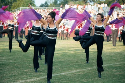 The Jacksonville State University Marching Southerners perform during a Fall 2000 performance, possibly a band exhibition performance at Tuscaloosa County High School in Northport, AL. The 2000 show title was "A Night in Birdland." Opener was "Birdland," the ballerina tune was "Night in Tunisia/Harlem Nocturne," and the closer was "Strawberry Soup." The band was under the direction of Kenneth G. Bodiford. (before October 2000)