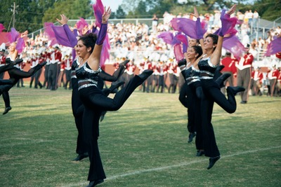 The Jacksonville State University Marching Southerners perform during a Fall 2000 performance, possibly a band exhibition performance at Tuscaloosa County High School in Northport, AL. The 2000 show title was "A Night in Birdland." Opener was "Birdland," the ballerina tune was "Night in Tunisia/Harlem Nocturne," and the closer was "Strawberry Soup." The band was under the direction of Kenneth G. Bodiford. (before October 2000)