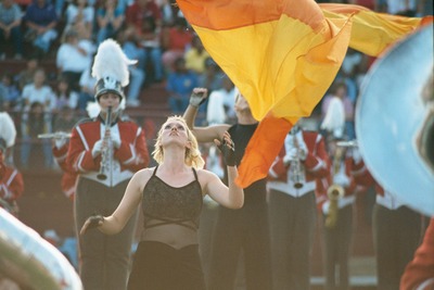 The Jacksonville State University Marching Southerners perform during a Fall 2000 performance, possibly a band exhibition performance at Tuscaloosa County High School in Northport, AL. The 2000 show title was "A Night in Birdland." Opener was "Birdland," the ballerina tune was "Night in Tunisia/Harlem Nocturne," and the closer was "Strawberry Soup." The band was under the direction of Kenneth G. Bodiford. (before October 2000)