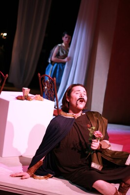 Pictured: Estefania Cuevas, Eric Wilcox; Performed: 15-18 Jan 2009; Wolfgang Amadeus Mozart's Cosi fan tutte was directed by Nathan Wight with assistant direction by Teresa Stricklin. The conductor was Dr. Keith Whitlock, technical director was Josh Whitt, lighting designers were Alex Becker and Andrew Becker, costume designer was Chaney Billips, assistant costumer was Lynn Luke, coach and consultant was Jennie Wall, supertitles was Dani Jones, stage managers were Peter Wilder and Michael Ervin, house manager was Cody Harrell, rehearsal accompanists were Steven Diblasi and Gena Vineyard, publicity was Bill Sparrowhawk, poster and program art were Grant Allen, photographer was Gaye Phillips.
